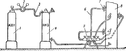 Рис. 9.10. Схема установки для пропитки древесины под давлением: 1 -баллон со сжатым воздухом (азотом); 2 - кислородный редуктор; 3 - металлическая трубка; 4 баллон с пропиточным раствором; 5 - распределительная коробка; 6 - резиновые шланги; 7 - полые сверла; 8 - деревянная свая. Подтягивание ослабленных болтов производится в первые два года эксплуатации моста не реже 2 раз в год, а в дальнейшем 1 раз. После подтягивания болтов резьбу смазывают автолом или солидолом. Болт в сопряжении должен выступать над гайкой не менее чем на три-пять витков нарезки. Шайбы под болты принимают толщиной не менее 6 мм и диаметром (стороной квадрата) не менее 3,75 диаметра болта. 9.4.5. Для защиты древесины от гниения применяют водорастворимые и маслянистые антисептики, а также антисептические пасты. В качестве растворимого антисептика могут быть использованы препараты ХМ-5, МХХ15 и МХХ-444 и др. Хромат меди ХМ-5 состоит из 10–12 %-ного раствора смеси медного купороса и бихромата натрия, технического (ГОСТ 2651-78), которые принимают в соотношении 1:1 по массе. Раствор готовят при температуре окружающего воздуха 15-20С. 9.4.6. Из маслянистых антисептиков рекомендуется каменноугольное масло (ГОСТ 2770-74), смешанное с зеленым маслом или керосином. Антисептическая паста состоит из фтористого натрия, битума БН-III, керосина и торфяной муки (% по массе):51:23:22:4 (соответственно). 9.4.7. Элементы, имеющие влажность выше 30 % или находящиеся в условиях повышенной влажности, пропитывают водорастворимым антисептиком под давлением. Пазы шпаклюют антисептической пастой. Обработка клееной древесины выполняется маслянистым антисептиком. 9.4.8. Работы по антисептированию древесины водорастворимым антисептиком или пастами рекомендуется выполнять весной, когда влажность древесины наибольшая. Маслянистые антисептики применяют в сухую погоду в летний период. 9.4.9. Пропитку древесины рекомендуется производить по методу местной глубокой пропитки под давлением с помощью специальные установок (рис. 9.10). Инъекторы закрепляют вдоль элемента на расстоянии 80-100 см, а по окружности - четыре инъектора на равном расстоянии. Рабочее давление составляет 0,2 - 0,8 МПа. 9.4.10. Сваи пойменных опор и ледорезов в уровне грунте на высоту возможного загнивания следует закрывать антисептическими бандажами. Между бандажами и сваей наносят два слоя антисептической пасты (один по свае, а второй по внутренней поверхности бандажа перед его установкой). Бандаж изготавливают из толя, рубероида или мешковины и прикрепляют вязальной проволокой. Верхнюю часть бандажа покрывают битумной гидроизоляцией. 9.4.11. Доски верхнею настила, имеющие износ более 3 см, заменяют на новые. Не разрешается ставить заплаты в виде обрезков (коротких) досок. Доски в местах их отставания от нижнего настила или поперечин плотно пришивают, а высыпающие гвозди забивают. Доски тротуарного настила на консолях поперечин укладывают с зазором 2 см для вентиляции. Во избежание расстройства настила колесоотбойные брусья плотно пригоняют к настилу и затягивают болтами. 9.4.12. Опоры и ледорезы после прохода паводка и ледохода очищают от ила и мусора, и все повреждения исправляют. Стертую обшивку ледореза и опоры заменяют, а новую (из пластин или брусьев) устанавливают с просветами до 1 см для проветривания. На реках с сильным ледоходом обшивку ледорезов и опор выполняют из