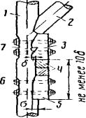 Рис. 9.11. Ремонт сопряжения подкоса со сваей 1 - стойка или свал; 2 - подкос; 3 - подбабок; 4 - клинья; 5 - подбабок усиления; 6 - болт Æ 16 мм; l= 500 мм; 7 - скол 9.4.22. На пойменных опорах при загнивании свай заменяют весь поврежденный участок. Нижний стык сваи устраивают ниже зоны загнивания, а верхний стык вставки размещают в месте пересечения сваи со связями. Стык выполняют в полдерева и укрепляют хомутами. 9.4.23. На речной опоре, если свая не затронута гнилью, заменяют только загнивший участок нароста. При загнивании сваи в стыке новый стык устраивают ниже старого и выполняют в полдерева. Хомуты, стягивающие стыки свай с наростками, изготавливают из полосовой стали толщиной не менее 8-10 мм. В случае загнивания сваи в уровне, близком к воде, стык вставки со сваей выполняют в торец на металлическом штыре и перекрывают накладками на болтах (рис. 9.12).