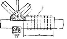 Рис. 9.8. Усиление опоры железобетонными поясами: 1 - пояс усиления; 2 – трещины. 9.2.37. В тех случаях, когда опоры имеют отдельные сквозные трещины, разделяющие их на отдельные блоки, вокруг опор устраивают стальные каркасы или железобетонные пояса. В устоях мостов (рис. 9.7) стальные каркасы устраивают, когда имеются трещины, отделяющие переднюю стенку или обратные стенки устоя от массива. Железобетонные пояса (рис. 9.8) применяют для предупреждения развития трещин или общего расстройства кладки массивных опор. Сцепление между поясом и поверхностью опоры достигается устройством в кладке насечки и постановкой стальных анкеров, к которым прикрепляют арматуру пояса. Анкеры вставляют в скважины (шпуры) глубиной 50 см и заделывают цементным раствором. Их располагают в два-три ряда по высоте пояса и через 1 м по длине. 9.2.38. Для усиления старых массивных каменных опор, а также трещиноватых и со значительным разрушением бетона массивных бетонных и железобетонных опор, применяют железобетонные обоймы (оболочки), устраиваемые вокруг опоры на полную ее высоту. Для усиления массивной части фундаментов рекомендуется также применять бетонные, железобетонные и металлические оболочки. Конструкция усиления принимается по проекту. 9.2.39. Повышение несущей способности оснований фундаментов может быть достигнуто развитием площади опирания фундамента, устройством дополнительного свайного ростверка вокруг опоры включением его в совместную работу с опорой. 9.2.40. При наличии в бесшарнирных сводах трещин в ключе и пятах, вызванных обычно деформациями опор, следует сначала принять меры к прекращению деформации, а затем приступить к заделке трещин в сводах. 9.2.41. Изгибаемые элементы пролетных строений разрезных балочных систем, имеющие повреждения арматуры растянутой зоны, могут быть восстановлены (или усилены) путем увеличения сечения элементов, устройства шпренгеля из дополнительной арматуры с последующим ее натяжением и приклеивания дополнительного материала к основному связующими составами. При значительном повреждении элемента его заменяют. Выбор варианта усиления определяется технико-экономическим обоснованием. Увеличение сечения элемента достигается введением дополнительной арматуры в ослабленную зону с последующим ее бетонированием и объединением с основным элементом. Усиление растянутой зоны балок может быть выполнено также методом «наклейки» металлического листа к бетону снизу балок эпоксидными клеями в соответствии с действующими инструкциями по производству таких работ. 9.2.42. Пролетные строения могут быть усилены путем введения дополнительных главных несущих элементов (балок, арок), повышения поперечной жесткости конструкции, увеличения высоты несущих элементов (увеличение толщины плиты проезжей части и т.д.). 9.2.43. Уширение мостов производят путем уширения плиты проезжей части или введения дополнительных элементов в конструкцию пролетных строений в соответствии с действующими инструкциями по уширению мостов. 9.3. Содержание и ремонт металлических мостов. Содержание 9.3.1. Основными задачами содержания металлических мостов и сталежелезобетонных пролетных строений являются: предупреждение появления и развития коррозии металла; очистка проезжей части и тротуаров, а также несущих элементов конструкции от мусора, грязи, 
