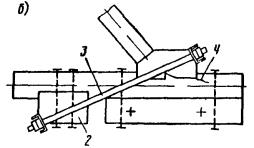 Рис. 9.13. Ремонт узлов: а - промежуточных; б - опорных; 1 - клинья; 2 - деревянный вкладыш усиления; 3 - тяж усиления; 4- трещина. Содержание 9.5.1. Основными задачами содержания и текущего ремонта труб являются: поддержание нормального водотока через трубу и предупреждение образования дефектов в насыпи и проезжей части над трубой и в конструкции трубы, устранение мелких повреждений. 9.5.2. Водопропускные трубы очищают летом от мусора и ила, а зимой от снега и льда. Работы производят вручную скребками, механизированным способом или с помощью гидромонитора. Гидромонитором трубы очищают сначала с низовой стороны, освобождая русло и трубу от мусора и ила, а затем производят окончательную промывку, направляя струю в трубу с верховой стороны. На зимний период все трубы следует закрывать на входе и выходе хворостяными матами, щитами для предотвращения проникания снега внутрь трубы. На водотоках в щитах оставляют отверстия на случай оттепелей. 9.5.3. Русло на подходе к трубе рекомендуется спрямлять и укреплять его дно и берега каменной наброской. В зоне растекания потока за трубой при наличии размыва берегов укрепление их обязательно. Подводящие и отводящее русла, водобойные колодцы и гасители на выходе из трубы регулярно очищают от наносов и посторонних предметов. Необходимо принимать также меры по предупреждению оврагообразования, а в случае их образования - производить закрепление. 9.5.4. При появлении небольших затухающих деформаций осадки или смещения звеньев труб дефектные швы заделывают, а лоток трубы выравнивают бетоном. Зазоры между звеньями в швах заделывают просмоленной паклей, а затем жестким цементным раствором. Трещины и сколы в бетоне и кладке заделывают согласно правилам, изложенным в п. 9.2, а дефекты в металлических трубах устраняют согласно указаниям п. 9.3. Ремонт 9.5.5. Ремонт труб рекомендуется проводить в летний период. При развитии значительных деформаций (растяжка труб, вертикальное смещение звеньев и т.д.) производят перекладку отдельных звеньев труб. Если гидравлическим расчетом обоснована возможность беспрепятственного пропуска водного потока при меньшем отверстии трубы, допускается усиливать дефектные трубы путем установки новых звеньев внутри старых с устройством плавных сопряжении (бетоном или полимербетонными материалами) между ними. 9.5.6. Трубы, имеющие большие повреждения элементов, при невозможности усиления подлежат перестройке. До выполнения ремонтных работ такие трубы необходимо временно укреплять постановкой рам, подпорок, кружал и т.д. За трубами, имеющими стесненное отверстие, устанавливают наблюдение, имеющее целью не допускать закупорки отверстия. 9.5.7. При появлении признаков повреждения гидроизоляции производят ее ремонт. Для этого вскрывают насыпь над дефектным участком трубы, заполняют швы паклей, пропитанной битумной мастикой. Дефектные швы на ширину 25 см, а также участки с видимыми нарушениями гидроизоляции покрывают несколькими слоями рулонного материала, чередуя с битумной мастикой. Остальную часть наружной поверхности трубы обмазывают двумя слоями битумной мастики. Засыпку трубы производят слоями по 15-20 см с тщательным уплотнением грунта трамбовками. 9.5.8. Пустоты за трубами, образующиеся вследствие вымывания грунта через дефектные швы, при небольших высотах насыпи заполняют грунто