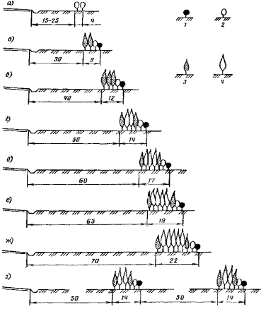 Рис. 10.1. Типовые схемы снегозащитных насаждений автомобильных дорог: а – при объеме снегоприноса до 25 м3/м; б – до 50 м3/м; в – до 75 м3/м; г – до 100 м3/м; д – до 125 м3/м; е - до 150 м3/м; ж - до 200 м3/м; з - до 250 м3/м; 1 - кустарники низкие; 2 - кустарники высокие; 3 - деревья низкокронные; 4 - деревья высококронные.