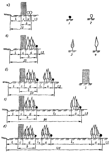 Рис. 10.2. Типовые схемы усиления существующих снегозащитных насаждений: а - при объеме снегопереноса до 25 м3/м; б - до 50 м3/м; в - до 100 м3/м; г - до 150 м3/м; д - до 250м3/м; 1 - кустарники низкие; 2 - кустарники высокие; 3 - деревья низкокронные; 4 - деревья высококронные; 5 - существующая лесная полоса. Таблица 10.2