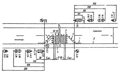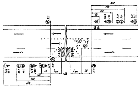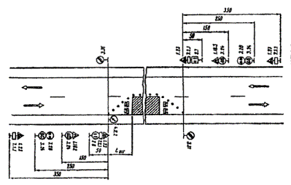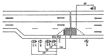 Рис. 3.2. Организация движения и ограждение места дорожных работ, выполненных на половине ширины проезжей час двухполосных дорог При выполнении дорожных работ на разделительной полосе многополосной дороги расстановку дорожных знаков следует выполнить в соответствии с рис. 3.7. 3.6. На дорогах с разделительной полосой, имеющих четыре и более полос движения, в случае закрытия половины ширины проезжей части на период дорожных работ для пропуска транспортных средств следует устраивать специальные проезды через разделительную полосу (рис. 3.8). С целью заблаговременного оповещения водителей транспортных средств о предстоящем перестроении вне населенных пунктов за 500 м до разрыва в разделительной полосе устанавливают знак 5.36 «Перестроение в другую проезжую часть» с табличкой 7.1.1. «Расстояние до объекта». В населенных пунктах знак 5.36 с табличкой 7.1.1 устанавливают на расстоянии 50-100 м от места разрыва в разделительной полосе. 3.7. В случае устройства на двухполосных дорогах уширения проезжей части на полосу движения для обеспечения бесперебойного пропуска транспортных средств на участках дорожных работ длиной более 30 м организацию движения и ограждения зоны работ следует выполнять в соответствии с рис. 3.9. 3.8. В целях более полного использования инерции разгона в местах производства работ на затяжных подъемах допускается скорость транспортных средств 60 км/ч, если позволяют условия движения. 3.9. При выполнении дорожных работ на дополнительной полосе на подъеме следует организовать движение и ограждать место работ в соответствии со схемой, представленной на рис. 3.10. Если зона ремонтных работ расположена на расстоянии не более 200 м от начала дополнительной полосы, рекомендуется с помощью ограждающих устройств закрывать эту полосу от ее начала до конца зоны работ.
