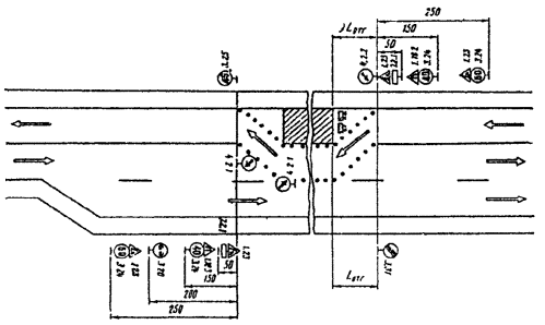 Рис. 3.22. Организация движения и ограждение места дорожных работ, выполняемых на всей ширине проезжей части левоповоротного съезда пересечения в разных уровнях