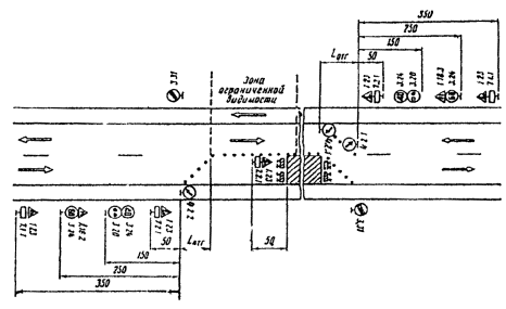 Рис. 3.13. Организация движения и ограждение места дорожных работ на участках с ограниченной видимостью Участки с ограниченной видимостью 3.11. Участки с ограниченной видимостью представляют собой существенную опасность для движения транспортных средств. При производстве дорожных работ на таких участках эта опасность увеличивается, поэтому за границу зоны дорожных работ необходимо принять начало участка с ограниченной видимостью и временные дорожные знаки установить перед этим участком. 3.12. При проведении дорожных работ на участках с ограниченной видимостью как в плане, так и в продольном профиле, организуют движение и ограждают место работ в соответствии с рис. 3.13. Примыкания и пересечения 3.13. В зонах пересечений организация движения должна быть подчинена принципу очередности проведения дорожных работ, который состоит и следующем: работы начинают на второстепенных дорогах и отдельных элементах пересечений, постепенно переходя к наиболее загруженным, используя отремонтированные элементы для переключения на них движения. 3.14. В зоне пересечений и примыканий в одном уровне дорожные работы выполняют в три этапа: 1) дорожные работы на обочинах, при необходимости, строительство правоповоротных переходно-скоростных полос (рис. 3.14); 2) дорожные работы на проезжей части второстепенной дороги (на всей или по полосам) с переключением движения на отремонтированные обочины или правоповоротные переходно-скоростные полосы (рис. 3.15); 3) дорожные работы на проезжей части главной дороги (на всей ширине или по полосам, включая переходно-скоростные полосы для левого поворота) с переключением движения на обочины или правоповоротные переходно-скоростные полосы (рис. 3.16). В этом случае возможны два варианта организации движения при работах в центральной части пересечения: пропуск транспортных средств в объезд участка работ по обочинам главной дороги с перепробегом транспортного потока второстепенного направления и левоповоротного потока с главного направления; пропуск транспортных средств по отремонтированному участку главной дороги. Если видимость на перекрестке ограничивают работающие машины и механизмы, организацию движения осуществляют с помощью регулировщика.