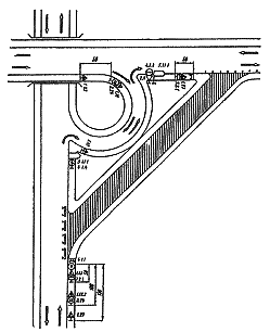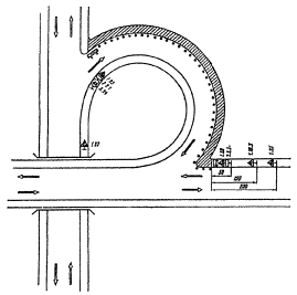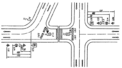 Рис. 3.23. Организация движения и ограждение места дорожных работ при закрытии левоповоротного съезда пересечения в разных уровнях с устройством разворота на одной из дорог путем последовательного проезда трех левоповоротных съездов (рис. 3.34). 3.19. Схема организации движения с устройством разворота на одной из дорог допустима только при интенсивности движения по главному направлению до 300 авт./ч вследствие возникающих при данной схеме помех транспортным средствам прямого направления.