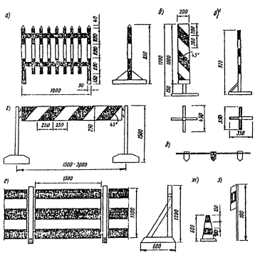 Рис. 4.2. Ограждения и направляющие устройства: а - штакетный барьер; б - направляющая веха; в - деревянная стойка; г - барьер с деревянной или металлической перекладиной; д - сигнальный шнур с цветными флажками; е - инвентарный щит; ж - направляющий конус; з - сигнальный флажок 4.36. Сигнальные шнуры (рис. 4.2, в), используемые для ограждения мест работ, закрепляют к установленным штакетным барьерам, вехам или конусам. Высота подвески шнуров над поверхностью дороги должна быть не менее 80 см. 4.37. При длительных сроках проведения работ наряду с другими средствами организации движения рекомендуется применять временную дородную разметку. При этом постоянная разметка, если она противоречит целям организации движения, а на период ремонта должна быть ликвидирована или закрашена серой краской, либо должны быть установлены знаки, разрешающие водителям отступать от ее требований. Временную разметку наносят в соответствии с требованиями ГОСТ 23457-79 «Технические средства организации дорожного движения. Правила применения». 5. ОСНОВНЫЕ ПОЛОЖЕНИЯ ПО ОБЕСПЕЧЕНИЮ ТЕХНИКИ БЕЗОПАСНОСТИ ПРИ ВЫПОЛНЕНИИ ДОРОЖНЫХ РАБОТ5.1. Ежедневно перед началом ремонтных работ необходимо проверить наличие технических средств, предусмотренных схемой, и при необходимости заменить пришедшие в негодность или установить отсутствующие средства. 5.2. Дорожные машины и оборудование должны быть окрашены в ярко-желтый цвет с нанесенными на габаритные части полосами красного цвета. 5.3. Как правило, дорожные машины и оборудование на период темного времени суток, если в этот период не проводятся работы, должны быть убраны за пределы земляного полотна. Как исключение, их можно размещать не ближе 1,5 м от границы ближайшей полосы, по которой осуществляется движение, при этом дорожные машины должны быть ограждены с обеих сторон барьерами с сигнальными фонарями желтого цвета, зажигаемыми с наступлением темноты. Барьеры устанавливают в 10-15 м от машин. 5.4. Рабочие, выполняющие дорожные работы, должны быть обеспечены сигнальной одеждой (жилетами) ярко-оранжевого цвета, надеваемой поверх обычной спецодежды. ПриложениеПример ведомости потребного количества дорожных знаков для производства дорожных работ на половине ширины проезжей части автомобильных дорог с двумя полосами движения