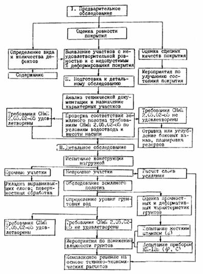 Примечания. 1. Показатель ровности покрытия d* соответствует показаниям толчкомера ТХК-2, установленного на автомобиле УАЗ-452. При использовании других марок автомобилей требуется предварительная тарировка прибора. 2. Допустимый %, деформирования покрытия rдоп определяют по формуле: rдоп= I-Кн (1.1) где Кн - уровень надежности дорожной одежды. 1.7. Прочность дорожной одежды в течение расчетного периода может весьма существенно колебаться не только изо дня в день, но и в течение суток. В этих условиях результаты линейных испытаний дорожных конструкций должны быть приведены к сопоставимому виду. Необходимые поправки вносят по результатам ежедневных контрольных испытаний на специально выбранных контрольных точках. 1.8. По результатам полевых испытаний, обработанных методами математической статистики, определяют фактические показатели прочности дорожных одежд, сопоставляют их с величинами, требуемыми по условиям движения, и принимают решение по несущей способности обследованных дорог. 1.9. Требуемые показатели прочности назначают с учетом фактической интенсивности транспортного потока на дороге, приведенной к расчетным нагрузкам. Для приведения автомобилей к расчетным нагрузкам используют коэффициенты приведения, назначенные с учетом типа дорожной одежды или прочности дорожной конструкции. 1.10. Прочными считаются те участки дорог, на которых фактические показатели прочности оказываются не ниже требуемых. Для непрочных участков рассчитывают слои усиления или назначают мероприятия по ограничению движения автомобилей по осевым нагрузкам в неблагоприятные по условиям увлажнения периоды года. Возможен и комбинированный подход, когда в течение некоторого периода ограничивают движение по дороге, а затем усиливают дорожную конструкцию, в каждом конкретном случае вопрос о проведении того или иного мероприятия должен решаться на основании технико-экономических расчетов. 2. ОБСЛЕДОВАНИЕ НЕЖЕСТКИХ ДОРОЖНЫХ ОДЕЖД С ЦЕЛЬЮ ОЦЕНКИ ИХ ПРОЧНОСТИ2.1. Порядок оценки 2.1.1. Оценка прочности дорожных одежд - важнейшее звено в общем порядке обследования дорожных конструкций (рис. 2.1), определяемом Техническими правилами ремонта и содержания, автомобильных дорог (ВСН 24-88 Минавтодора РСФСР). Все работы проводят в три основных этапа обследования: предварительное, подготовка к детальному и собственно детальное. 2.1.2. При проведении предварительного обследования вид и количество дефектов проезжей части определяют для уточнения фактической степени деформирования покрытия (см. п. 1.6) и назначения границ характерных участков. Фактическую степень деформирования покрытия определяют по полосам наката и оценивают длиной участка с прочностными дефектами в долях от общей протяженности характерного участка.