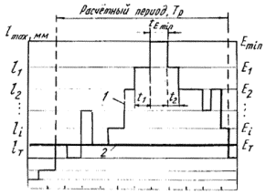При отсутствии данных о фактическом периоде эксплуатации на момент проведения полевых испытаний величину модуля упругости Ет и количество расчетных состояний можно определять для условий П-Ш дорожно-климатических зон по данным 25-суточного периода наибольшего ослабления конструкции, т.е. когда расчетный период Тр (см. рис. 3.1) принимается равным 25 сут. Календарные дни Рис. 3.1. Пример зависимости прогиб-время для приведения результатов линейных испытаний к сопоставимому виду: 1 - изменение состояния дорожной конструкции во времени на контрольной точке; 2 - предельное состояние дорожной конструкции, при котором воздействие автомобилей еще существенно; Е1, Е2 и т.д. - модули упругости при различных расчетных состояниях дорожной конструкции 3.1.4. Корректировку результатов линейных испытаний дорожных конструкций путем их приведения к сопоставимому виду выполняют по следующей формуле: