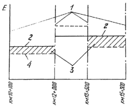 2.3 Подготовка к детальному обследованию 2.3.1. Подготовку к детальному обследованию проводят одновременно с предварительным обследованием дорожных покрытий или непосредственно после проведения визуального обследования. 2.3.2. На первом этапе работ анализируют: продольный профиль и план трассы (проектная и исполнительная документация); условия строительства (реконструкции) дороги, т.е. погодно-климатические условия в момент возведения земляного полотна и устройства конструктивных слоев дорожных одежд, технологию производства работ на всех этапах устройства земляного полотна и дорожных одежд (журналы производства работ); мероприятия по содержанию дороги и данные о времени проведения ремонтных работ, виды ремонтов с указанием состояния дорожной одежды перед ремонтом, объем и технологию выполненных работ, качество работ и применявшихся материалов, погодно-климатические условия при производстве ремонтных работ (паспорт, акты приемки работ, журналы производства ремонтных работ и т.д.); данные учета состава и интенсивности движения автомобилей за весь период эксплуатации, предшествующей обследованию (сводные ведомости по учету движения); данные о фактическом состоянии покрытия и результаты ранее проведенных обследований (отчеты по оценке прочности дорожной одежды, дефектные ведомости, отчеты о весенних и осенних осмотрах дороги и т.д.). 2.3.3. Данные анализа технической документации и дефектных ведомостей (см. п. 2.2.3) используют для назначения характерных участков в пределах перегонов, требующих детальных обследований. 2.3.5. Нахождение границ характерных участков производят с помощью сводной ведомости (рис. 2.2). При этом необходимо, чтобы длина характерного участка была не менее 500 м. 2.3.6. При определении границ характерных участков смежные участки могут быть объединены при прочих равных условиях, если: расчетные (проектные) модули упругости дорожных конструкций отличаются не более чем на 5%; требуемые модули упругости конструкций, определенные по фактическим интенсивностям расчетного движения при соблюдении первого условия, отличаются между собой не больше ±5%. 2.4. Испытание дорожных одежд нагрузкой (детальное обследование) 2.4.1. Полевые испытания дорожных конструкций проводят в расчетный и нерасчетный периоды года при условии обеспечения требований п. 1.6. 2.4.2. Полевые испытания следует начинать с испытания дорожных конструкций на контрольных точках. На каждом характерном участке (см. п. 2.3.4) выбирают одну контрольную точку в таком месте на покрытии, где состояние его по видам дефектов является характерным для данного участка. Если в пределах характерного участка развито несколько видов дефектов, занимающих примерно одинаковые площади, то контрольную точку надо располагать в пределах минимальных высот насыпи на участке или в зоне распространения дефекта, соответствующего худшему состоянию покрытия. Контрольные точки следует располагать на ближайшей к кромке покрытия полосе наката.