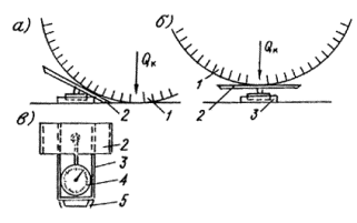 Рис. 1. Схема определения нагрузки Qк на колесо автомобиля с помощью переносных гидравлических весов модели КП-205: а - до взвешивания; б - в момент взвешивания; в - гидравлические весы модели KП-205 (вид сверху): 1 - внешняя пневматическая шина заднего колеса; 2 - грузовая площадка весов; 3 - корпус весов; 4 - манометр; 5 - ручка