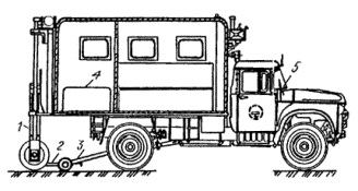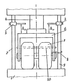 7. Продвигают автомобиль вперед на расстояние не менее 5 м. 8. Дожидаются пока отсчет по индикатору i после съезда автомобиля с точки измерения в течение 10 с не будет изменяться более чем на 0,005 мм и записывают его в журнал измерений. 9. Удвоенная разница отсчетов по индикатору до съезда автомобиля с точки и после съезда будет соответствовать прогибу покрытия в этой точке l: l = 2 (i ‑ io). (1) Закончив измерение прогиба на одной точке, переходят к другой. При переезде с одной контрольной точки на другую прибор можно не переводить в транспортное положение. Следует только снять индикатор и осторожно погрузить прибор в кузов автомобиля либо подвесить его на кронштейны сбоку автомобиля. 2. Передвижная лаборатория модели КП-502 МП для оценки несущей способности автомобильных дорог Передвижная лаборатория модели КП-502 МП (рис. 2) состоит из комплекта приборов и оборудования для испытания дорожных одежд методами статического и кратковременного нагружения (установка динамического нагружения УДН-НК, длиннобазовый прогибомер модели КП-204, прибор для измерения расстояния КП-203, переносные гидравлические весы модели KП-205 и др.). Рис. 2. Размещение основных приборов и оборудования в передвижной дорожной лаборатории КП-502 МП: 1 - установка динамического нагружения УДН-ПК; 2 - балка для крепления датчика; 3 - тележка для крепления балки; 4 - бензоэлектрический агрегат; 5 - измерительная система сбора и обработки данных на базе микро-ЭВМ Установку динамического нагдужения УДН-НК (навесную с гибким штампом) монтируют сзади кузова автомобиля (см. рис. 2). Особенность ее - передача усилия от падающего груза массой 250 кг через сдвоенные авиационные пневматические колеса, обеспечивающие площадь отпечатка и удельную нагрузку на покрытие эквивалентные отпечатку и нагрузке расчетного автомобиля группы А. Для подъема груза используют электродвигатель мощностью 1 кВт. Регистрацию прогибов осуществляют сейсмоприемником СВ-20. Измерительный датчик смонтирован на специальной тележке и находится между скатами пневматика. Аппаратура для сбора и первичной обработки данных испытаний расположена в кабине водителя. Нагружение дорожной одежды проводят с остановкой лаборатории в каждой точке испытания. Максимальная производительность УДН - до 8 км/ч при 20 испытаниях на 1 км. В процессе испытаний и при переездах от точки к точке сдвоенные пневматики находятся в контакте с дорожным покрытием. При длительных переездах установку приподнимают в транспортное положение. Рис. 3. Схема тарировки колеса для установки УДП-НК: 1 - станина пресса; 2 и 9 - направляющие пресса; 3 и 5 - струбцины с жесткими пластинами, от которых измеряют сжатие (осадку) колеса под нагрузкой; 4 - поршень пресса; 6 - обойма для крепления колеса; 7 - испытываемое колесо; 8 - цепи, обеспечивающие безопасность работы; 10 - стопорная чека; h1,2 - расстояние от верха обоймы 6 до струбцины 3 и 5 Пневматические колеса, играющие роль амортизатора, требуют периодической тарировки - тарировать нужно одновременно оба ската, чтобы осреднить некоторые их деформативные различия в условиях достаточно близких к условиям нагружения на дороге, где усилие также действует сразу на два ската. Покрышки скатов должны находиться в хорошем состоянии и иметь неизношенный протектор (рис. 3). Устанавливают скаты на гидравлическом прессе (1, 2, 4, 9) с макси