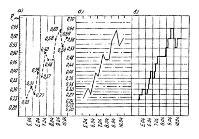 Примечание. Точность длиннобазового прогибомера ±0,01 мм. Построение графика прогиб - время следует осуществлять в следующей последовательности. Прежде всего, масштаб графиков выбирают из такого расчета, чтобы в их пределах могли уместиться все наблюдаемые значения прогибов на контрольных точках. При этом на ось абсцисс наносят непрерывный масштаб времени в сутках и часах (удобно наносить границы суток). Через точки оси ординат, соответствующие дискретному ряду прогибов (см. табл. 1), проводят сплошные горизонтальные линии дискретного масштаба. Из середины полученных отрезков на оси ординат проводят дополнительные штрих пунктирные линии, ограничивающие зону влияния значений дискретного масштаба. Затем наносят на график результаты измерения прогибов на контрольных точках, пользуясь непрерывным масштабом по оси ординат (рис. 1, а). Последовательно соединяют полученные точки пунктирными линиями и получают фактическую закономерность изменения обратимого прогиба во времени. Полученную закономерность преобразуют, принимая во внимание, что в пределах зоны влияния дискретного масштаба изменение прогибов не существенно. Для этого из точки пересечения штрих пунктирной линии с фактической закономерностью проводят вертикаль до пересечения с соседними линиями дискретного масштаба (рис. 1, б). Последовательно соединяя точки пересечения, получают ступенчатую закономерность изменения прогиба во времени, соответствующую точности измерения прогибов при испытании дорожной одежды (рис. 1, в). ПРИЛОЖЕНИЕ 5РАСЧЕТНЫЕ НАГРУЗКИ h КОЭФФИЦИЕНТЫ ПРИВЕДЕНИЯ СОСТАВА ДВИЖЕНИЯ К РАСЧЕТНЫМ АВТОМОБИЛЯММноголетние исследования работы дорожных одежд под действием автомобилей с разными осевыми нагрузками и грузоподъемностью свидетельствуют о возможности замены интенсивности движения транспортного потока интенсивностью, приведенной к различным автомобилям, принимаемым в качестве расчетных. При этом результаты оценки несущей способности конструкций не зависят от того, к каким нагрузкам, принимаемым за расчетные, осуществлялось приведение воздействия отдельных автомобилей в составе транспортного потока (при условии, если для каждой расчетной нагрузки используются соответствующие графики или показатели требуемой прочности). Учитывая это, для удобства оценки прочности и расчета усиления нежестких дорожных одежд целесообразно ориентироваться на использование в качестве расчетных только двухосных автомобилей группы А, основные параметры которых приведены в табл. 1.