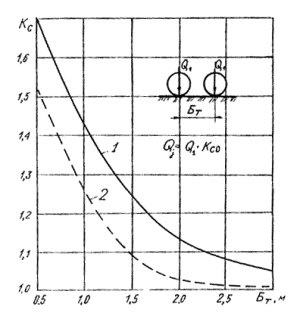 Многоосные автомобили приводят к эквивалентным по воздействию двухосным автомобилям с помощью графика коэффициентов влияния смежной оси в зависимости от расстояния между осями (рис. 1). Для определения нагрузки Qj на заднюю ось двухосного автомобиля величина нагрузки Q1 на сближенную ось умножается на соответствующий коэффициент Ксо влияния. В случае, если расстояние между осями автопоезда превышает 3 м, проезд каждой оси рассматривают как проезд двухосного автомобиля с нагрузкой на заднюю ось, равной нагрузке, приходящейся на рассматриваемую ось транспортного средства. Рис. 1. Зависимость коэффициента влияния смежной оси (Кс) от базы тележки (Бт), м: 1 - для капитальных и облегченных дорожных одежд; 2 - для переходных дорожных одежд ПРИЛОЖЕНИЕ 6СТАТИСТИЧЕСКАЯ ОБРАБОТКА РЕЗУЛЬТАТОВ ЛИНЕЙНЫХ ИСПЫТАНИЙДля определения .фактического прогиба дорожной конструкции lф, соответствующего допускаемому проценту деформированной поверхности покрытия, результаты линейных испытания обрабатывают в следующей последовательности. Прежде всего для оценки особенностей распределения прогибов на каждом характерном участке назначают величину интервала (разряда) распределения, исходя из точности испытаний +5 %. Значение середины интервала d (в мм) вычисляют по формуле: