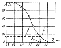 где п - количестве испытаний на характерном участке; Dl - отклонение величины прогиба от среднеарифметического значения, %. Исходя из точности полевых испытаний, величину Dl назначают ±10 %; ±20, ±30 % и т.д. в зависимости от реальных значений прогибов на участках. Положительные значения принимают для прогибов, превышающих по величине среднеарифметическое значение прогибов на участке, отрицательные - для прогибов, меньших среднеарифметического значения; li - прогиб дорожной конструкции, измеренный в процессе линейных испытаний и приведенным к сопоставимому виду в соответствии с п. 3.1.4, мм. Определяют интервалы прогибов. Границы интервалов устанавливают делением суммы смежных значений пополам. Прогибы, попадающие на границу смежных интервалов, рекомендовано относить к интервалам меньших прогибов. Распределение результатов испытания по интервалам показано в табл. 1 для следующих величин установленных прогибов: 0,41 мм; 0,31; 0,52; 0,67; 0,62; 0,46; 0,57; 0,41; 0,46; 0,36; 0,60; 0,37; 0,46; 0,43; 0,56; 0,46; 0,59; 0,47; 0,53 и 0,37 мм. После распределения результатов испытаний по разрядам строят кумулятивную кривую, по которой решают вопрос о фактическом прогибе конструкции, соответствующем допускаемому проценту деформированной поверхности покрытия lф. Кумулятивную кривую (рис. 1) строят в координатах «накопленная частость - середина интервала» При ее построении следует осреднять значения накопленных частостей смежных интервалов (разрядов). Рис. 1. Общий вид кумулятивной кривой (построена по данным табл. 1): 1 - уровень, соответствующий допустимому проценту деформированной поверхности покрытия; 2 - кумулятивная кривая; lф - фактический прогиб характерного участка; d - величина обратимого прогиба, соответствующая середине интервала, мм; l - накопленная частость, % Для определения фактического значения прогиба lф из точки на оси ординат с допускаемой вероятностью повреждения покрытия rдопi проводят горизонталь до пересечения с кумулятивной кривой. Из точки пересечения опускают вертикаль на ось абсцисс, где находят искомое значение lф. Величину rдопi определяют по формуле: rдопi = 1 - Кн, (3)' где Кн - расчетный (проектный) или нормативный уровень надежности дорожной одежды. Нормативный уровень надежности принимают по табл. 7 прил. 7 в случаях, оговоренных в п. 4.6 и когда не имеют данных о проектной надежности дорожной одежды. Таблица 1