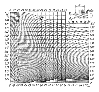 Примечание. Значения накопленной частости получены последовательным прибавлением частости очередного интервала (разряда). ПРИЛОЖЕНИЕ 7РАСЧЕТНЫЕ НОМОГРАММЫ И ПАРАМЕТРЫ ДОРОЖНЫХ КОНСТРУКЦИЙ С НЕЖЕСТКИМИ ТИПАМИ ПОКРЫТИЙ1. Расчетные номограммы Рис. 1. Номограмма для определения модуля упругости Е1 верхнего слоя двухслойной системы Рис. 2. Номограмма для определения общего модуля упругости двухслойной системы Еобщ 2. Деформационные характеристики грунтов земляного полотна Таблица 1