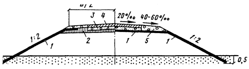 Примечание. При использовании зернистых материалов для устройства защитного слоя перед укладкой последующего конструктивного слоя дорожной одежды необходимо предусматривать выравнивание и восстановление защитного слоя на толщину 3 - 5 см. 4.15. Откосы выемок в подвижных песках покрывать защитным слоем не следует. При устройстве раскрытых выемок, разделываемых под насыпь, защитный слой устраивают в пределах насыпи. 4.16. При проектировании автомобильных дорог в песчаных пустынях следует учитывать возможность размыва земляного полотна водой, скапливающейся на проезжей части и обочинах дороги при выпадении ливневых дождей. Расчет ливневого стока следует производить по данным наблюдений Гидрометслужбы в соответствии с указаниями «Пособия по проектированию методов регулирования водно-теплового режима верхней части земляного полотна (к СНиП 2.05.02-85)» (М.:Стройиздат, 1989). Как правило, земляное полотно подлежит защите от размыва в районах с годовым количеством осадков более 100 мм на участках вогнутых вертикальных кривых, сопрягающих уклоны, превышающие поперечный уклон проезжей части, а также на подходах к указанным кривым. 4.17. При необходимости защиты от размыва откосов насыпи следует устраивать защитный слой по всему поперечному профилю земляного полотна. Наиболее рационально использовать с этой целью геотекстильные полотна. При ограниченном их количестве допускается сочетание геотекстильного материала с другими имеющимися материалами или связным грунтом. В этом случае геотекстильные полотна следует использовать на откосах насыпи с заделкой концевых частей не менее чем на 0,5 м (рис. 4). Рис. 4. Укрепление откосов насыпи геотекстилем: 1 - геотекстиль; 2 - защитный слой из пылевато-глинистого грунта; 3 - основание; 4 - покрытие; 5 - слой укрепления обочины. 4.18. Поверхность геотекстильных полотен, уложенных в откосной части земляного полотна, следует обрабатывать жидкими органическими вяжущими. В качестве вяжущих следует использовать: битум жидкий медленно- и среднегустеющий по ГОСТ 11955-82 с условной вязкостью 40-70 с; битумную эмульсию анионную по ГОСТ 18659-81, приготовленную на битуме марок БНД 130/200 и БНД 200/300; нефть высокосмолистую с условной вязкостью (по стандартному вискозиметру с отверстием 5 мм при температуре 60 °С) не менее 8 с. Расход битума, битумной эмульсии (в расчете на массу битума) и нефти принимают равным 0,5-1,0 л на 1 м2. 4.19. При расчете дорожной одежды земляное полотно из мелкого (барханного) песка с защитным слоем из пылевато-глинистого грунта рассматривают как однородную систему. Модуль упругости земляного полотна на поверхности защитного слоя принимают по данным прил. 4. 4.20. Защитный слой из пылевато-глинистого грунта или мелкого песка, обработанных вяжущими материалами, а также из песчано-гравийных и песчано-щебеночных смесей рассчитывают как конструктивный слой дорожной одежды в соответствии с требованиями Инструкции ВСН 46-83. Геотекстильную прослойку, применяемую взамен защитного слоя из пылевато-глинистых грунтов, при расчете дорожной одежды не учитывают. Модуль упругости земляного полотна из мелкого (барханного) песка в этом случае следует принимать равным 75 МПа, угол внутреннего трения - 33°, сцепление - 0,005 МПа. 5. ЗАЩИТА ДОРОГИ ОТ ПЕСЧАНЫХ ЗАНОСОВ.5.1. На песчаных массивах, примыкающих к дороге, во всех случаях выдел