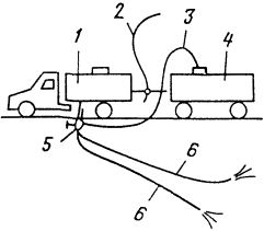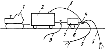 Примечание. Над чертой приведены показатели для южной части V дорожно-климатической зоны, под чертой - для северной. Приложение 5Технология закрепления поверхности песка жидкими вяжущими материалами (фиксаторами).1. Жидкие вяжущие материалы по поверхности песка разливают с помощью пескозакрепительного агрегата, состоящего из тягача, разбрызгивателя и приемной цистерны. В качестве тягача используют гусеничный трактор ДТ-75, а разбрызгивателя жидких вяжущих материалов (фиксаторов) - дождевальные аппараты, мотопомпы или пожарные автомобили. Разбрызгиватели снабжают сменными шлангами длиной до 250 м и брандспойтом. Приемную цистерну вместимостью 10 - 15 м3 устанавливают на тележке, находящейся в сцепе с трактором-тягачом. 2. Пескозакрепительный агрегат обслуживают звено поливочно-моечных машин, доставляющих воду, и звено битумовозов, подвозящих концентрированную эмульсию или какой-либо другой фиксатор с базы хранения или места приготовления. 3. Насосы разбрызгивателей для битумных эмульсий должны быть только центробежного действия. 4. Дождевальный аппарат (ДДН) навешивают на трактор-тягач, приводящий в действие ДДН через карданный вал от вала отбора мощности. Струенаправляющий ствол удаляют, и на его место присоединяют шланг переменной длины с брандспойтом для розлива фиксатора на закрепляемую поверхность песка (рабочий шланг), Ко второму фланцу присоединяют шланг длиной 6 - 10 м для подачи фиксатора в приемную цистерну (загрузочный шланг). На всасывающей трубе насоса дождевального аппарата также устанавливают трехходовой пробковый кран. К одному фланцу присоединяют 5 - 6-дюймовый гофрированный шланг. Второй конец этого шланга соединяют с приемной цистерной (питающий шланг). Ко второму фланцу присоединяют также гофрированный шланг длиной 6 - 10 м и диаметром 5 - 6 дюймов. Этот шланг предназначен для откачки фиксатора из транспортных цистерн (разгрузочный шланг). Насос дождевального аппарата, кроме разбрызгивания фиксатора, может перекачать его в приемную цистерну из транспортных цистерн (рис. 1 данного приложения). Рис. 1. Схема пескозакрепительного аппарата: 1 - трактор-тягач; 2 - пожарные шланги; 3 - загрузочный шланг; 4 - приемная цистерна; 5 - разгрузочный шланг; 6 - трехходовой пробковый кран; 7 - всасывающий (питающий) шланг; 8 - насос. Техническая характеристика агрегата на основе дождевального аппарата. Площадь розлива с одной стоянки, га 3 Расход эмульсии рабочего состава, л/с До 30 Дальность подачи эмульсии по шлангам, м 200 - 250 Производительность в смену, га 3 - 6 5. При использовании мотопомпы в качестве разбрызгивателя также требуются трактор-тягач и приемная цистерна. Для разгрузки транспортной цистерны мотопомпу, как и дождевальный аппарат, снабжают двумя шлангами и устанавливают трехходовой пробковый кран. Элементы пескозакрепительного агрегата на основе мотопомпы находятся в сцепе в такой последовательности: трактор-тягач - приемная цистерна - мотопомпа (рис. 2 данного приложения). Рис. 2. Схема пескозакрепительного агрегата на основе мотопомпы: 1 - трактор-тягач; 2 - приемная (наполнительная) цистерна; 3 - загрузочный шланг; 4 - трехходовой пробковый кран; 5 - пожарные шланги с брандспойтами; 6 - всасывающий шланг; 7 - мотопомпа; 8 - разгрузочный шланг. 6. При использовании в качестве разбрызгивателя пожарного автомобиля пескозакрепительн