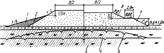где НГ - глубина сезонного оттаивания глинистого грунта насыпи, м; определяется по СНиП 2.02.04-88 или обязательному приложению 4; lиз, lм - коэффициенты теплопроводности соответственно мерзлых торфяного и глинистого грунтов насыпи, Вт/(м×К); определяются согласно СНиП 2.02.04-88. 3.50. На косогорных участках крутизной до 1:5, сложенных грунтами IV-V категорий просадочности, насыпи проектируют из крупнообломочных и песчаных, в том числе мерзлых, грунтов с бермой из теплоизоляционного материала (мохорастительный покров или торфяной грунт) с низовой стороны (рис. 12). Высота бермы должна составлять не менее половины высоты насыпи, рассчитываемой по первому принципу (см. обязательное приложение 4). Крутизну откосов назначают 1:2. 3.51. При проектировании по второму принципу земляное полотно конструируют в соответствии с поперечными профилями, приведенными на рис. 3 - 10. Допускается проектировать земляное полотно из местных глинистых грунтов из притрассовых или сосредоточенных резервов (рис. 13). В таких случаях верхнюю часть насыпи толщиной не менее 0,5 м предусматривают из крупнообломочного или песчаного грунта. При этом запрещается удалять или разрушать мохорастительный покров в основании насыпи. Крутизну откосов назначают 1:2. 3.52. Положение, размер и очертания резервов назначают согласно СНиП 2.05.02-85. Крутизну откосов резервов необходимо принимать не более 1:1,5 с учетом рекультивации. Рис.12. Поперечный профиль насыпи на льдонасыщенном