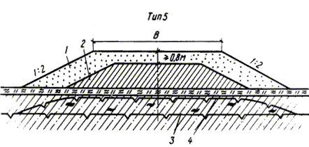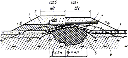 профиль насыпи с мерзлым грунтом в нижней части: 3.41. На плоскобугристых торфяниках, представляющих собой комплекс бугров высотой до 1 м, разделенных мочажинами шириной до 4 м и полосами стока, насыпи проектируют по первому принципу в соответствии с поперечными профилями, приведенными на рис.7. Для выравнивания ВГВМ предусматривают заполнение всех мочажин торфом в пределах ширины дорожной полосы (с запасом на осадку торфа). При пересечении полос стока толщина торфяного слоя в нижней части насыпи должна быть постоянной, равной не менее 0,3 м в уплотненном состоянии (см. рис.7, тип 9). Крутизну откосов назначают 1:2 при использовании песчаных грунтов, 1:1,5 - крупнообломочных. Рис.6. Поперечные профили насыпи на местности
