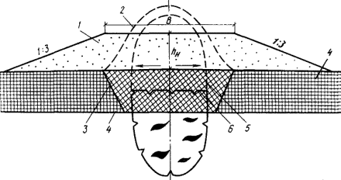 теплых периодов): Крутизну откосов торфяной насыпи назначают 1:2. Насыпь рассчитывают согласно обязательному приложению 6. 3.62. При пересечении глубоких логов и полос стока, а также на подходах к мостам через крупные водотоки (при соответствующем технико-экономическом обосновании, учитывающем требования охраны окружающей среды) допускается на грунтах I-IV категорий просадочности проектировать насыпь, возводимую способом гидромеханизации без обваловывания (рис. 21). Крутизну откосов в нижней части принимают 1:10 - 1:15, а в верхней - 1:2 для песчаного грунта при высоте волны до 0,4 м. Рис. 21. Поперечный