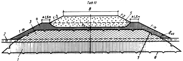 где Нн - нормативная глубина сезонного оттаивания грунта насыпи, м; определяется по СНиП 2.02.04-88 или обязательному приложению 4; h - толщина теплоизолирующего слоя, м; l, lГ, - коэффициенты теплопроводности соответственно теплоизоляционного материала и грунта насыпи, Вт/(м×К); определяются по СНиП 2.02.04-88; С, СГ - удельная теплоемкость соответственно теплоизоляционного материала и грунта насыпи, Дж/(кг×К); определяются согласно СНиП 2.02.04-88; 1,5 - коэффициент, м. Ориентировочную высоту насыпей с теплоизолирующим слоем из искусственных материалов можно принимать по табл. 12. 3.45. В 11 дорожно-климатической подзоне при остром дефиците крупнообломочных грунтов, а также качественных талых, сыпуче- и сухомерзлых песчаных грунтов высокие насыпи (более 2,5 м) допускается проектировать по первому принципу с использованием в их нижней части глинистых грунтов, в том числе твердомерзлых, в соответствии с поперечным профилем, приведенным на рис. 9 (тип 11). При этом необходимо предусматривать удаление мохорастительного покрова в пределах подошвы насыпи, с тем чтобы обеспечить дополнительный приток холода от нижележащих вечномерзлых грунтов III-IV категорий просадочности.