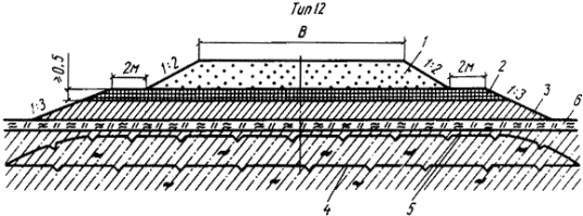 При дефиците торфяного грунта, применяемого для теплоизоляции откосов, насыпи проектируют с бермами (рис. 10, тип 12). Влажность глинистых грунтов должна соответствовать требованиям п. 3.20. Мохорастительный покров в пределах подошвы насыпи следует сохранять. Рис.10. Поперечный