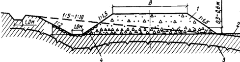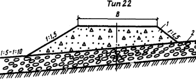 3.57. При устройстве разделяющих и армирующих прослоек из водопроницаемого в плоскости полотна материала дренирующий эффект прослойки, ускоряющий консолидацию насыпи, необходимо учитывать путем снижения требуемой степени консолидации основания на 10%. 3.58. В горно-таежной местности на склонах крутизной от 1:5 до 1:10, сложенных переувлажненными глинистыми грунтами с включениями гравия, щебня, дресвы в количестве до 30%, предусматривают удаление переувлажненного грунта в низовую сторону. Мощность слоя удаляемого грунта не должна превышать глубины сезонного оттаивания. Высоту насыпи (рис. 17, тип 21) назначают расчетом (см. обязательное приложение 4), но не менее 1 м. Нижнюю часть насыпи необходимо отсыпать на высоту 0,5 - 0,6 м из крупнообломочного грунта с размером ребер отдельных камней до 30 см, а верхнюю - из гравийно-песчаного материала. Крутизну откосов принимают 1:1,5. 3.59. На конусах выносов скальных обломочных пород и склонах, сложенных курумами, при крутизне от 1:5 до 1:10 насыпь проектируют из крупнообломочного грунта (рис. 18). Запрещается нарезка уступов в основании насыпи, чтобы не нарушить равновесия курумов. Высоту насыпи назначают расчетом, но не менее 1 м. Крутизну откосов принимают равной 1:1,5. Тип 21 Рис.17. Поперечный профиль насыпи на