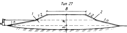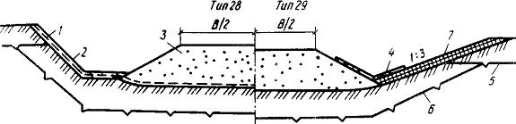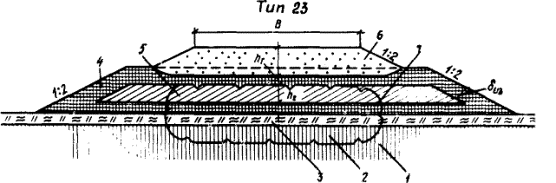 профиль насыпи, возводимой способом гидромеханизации: 3.63. На затопляемых участках, на подходах к мостам и другим искусственным сооружениям земляное полотно проектируют в насыпи из крупнообломочных и песчаных грунтов. При этом бровку земляного полотна предусматривают выше уровня расчетного горизонта воды не менее чем на 0,5 м плюс высота набега волны. 3.64. На участках местности с благоприятными грунтово-гидрогеологическими условиями (скальные, щебенистые, дресвяные, гравийно-песчаные грунты и т.п.) при отсутствии линз и прослоек льда допускается проектировать выемки по СНиП 2.05.02-85. 3.65. На участках местности 2-го типа допускается (при соответствующем технико-экономическом обосновании) проектировать выемки с заменой переувлажненных пылеватых глинистых грунтов песчаными или другими качественными материалами, предусматривая теплоизоляцию откосов или их укрепление геотекстилем (рис. 22). Мелкие выемки следует раскрывать или разделывать под насыпь (см. рис. 22, тип 29). Рис. 22. Поперечные