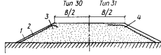 Примечания: 1. При зимней отсыпке насыпи на проектную высоту данные таблицы могут быть снижены на 20%. 2. Величину осадки мохорастительного покрова следует принимать равной 50% первоначальной толщины, а мохоторфяного слоя - 40% расчетной глубины его оттаивания. 3.70. Для защиты от водной и ветровой эрозии откосы насыпи (выемки), сложенные песчаными пылеватыми и глинистыми грунтами, следует укреплять слоем торфопесчаной смеси (40% торфа, 60% песка) толщиной 10 - 20 см. В смесь вводят семена многолетних трав. При отсутствии торфяного грунта можно предусматривать (на основе технико-экономических расчетов) укладку сплошного слоя геотекстиля с обязательным закреплением полотнищ на обочинах и подошве насыпи (бровке выемки) и последующее устройство защитного (от солнечной радиации) слоя толщиной 10 - 15 см из песка или гравийно-песчаной смеси (рис. 23, тип 30). При необходимости можно укреплять сплошными геотекстильными слоями, выполняющими противоэрозионную или армирующую функцию, и обочины и откосы (рис. 23, тип 31). Противоэрозионную роль выполняют также боковые поверхности полуобойм и обойм из геотекстиля (см. рис. 16). Рис. 23. Поперечный профиль насыпи с укреплением откосов и