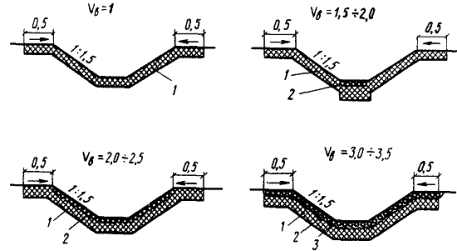 обочин геотекстилем: 3.71. Обочины земляного полотна следует укреплять гравийно-песчаным или щебеночным материалом, шламом, шлаком и другими отходами промышленного производства, геотекстилем (см. рис. 23, тип 31), а также бетонными плитами на основе технико-экономических расчетов. 3.72. В проектах автомобильных дорог согласно требованиям п. 1.5 настоящих норм необходимо предусматривать комплекс мероприятий по охране окружающей среды: рекультивацию карьеров и резервов, восстановление нарушенной техногенным воздействием прилегающей к дорогам полосы отвода, восстановление нарушенных территорий в местах дислокации дорожно-строительных подразделений - с определением требуемых объемов производства работ и их сметной стоимости. Водоотводные сооружения3.73. В зависимости от рельефных, гидрологических, гидрогеологических и мерзлотно-грунтовых условий поверхностные и грунтовые надмерзлотные воды отводят от дорожного полотна с помощью следующих сооружений: боковых водоотводных канав, лотков или лотков-полутруб, притрассовых резервов; нагорных мерзлотных валиков, приоткосных берм и нагорных канав; поперечных водоотводных канав. В 13 дорожно-климатической подзоне на участках с несливающейся вечной мерзлотой допускается (при соответствующем технико-экономическом обосновании) проектировать для отвода вод дренажные конструкции. 3.74. Размеры водоотводных сооружений назначают по гидравлическому расчету, учитывая приток вод и глубину их залегания, площадь осушаемой территории и ее инженерно-гидрологические условия. Форму поперечного сечения канав принимают такой, чтобы обеспечить механизацию работ и устойчивость откосов. 3.75. Водоотводные канавы проектируют на устойчивых основаниях, сложенных непросадочными и малопросадочными грунтами. При этом дно и откосы канав (кюветов), устройство которых предусматривается в легкоразмываемых грунтах, следует укреплять одиночным или двойным слоем луговой или тундровой дернины, камнем, гравийно-песчаной смесью, бетонными плитами, уложенными по мху, или геотекстильным материалом (рис. 24). Если скорость течения воды превышает допустимую для соответствующих типов укрепления, необходимо предусматривать перепады, быстротоки или водобойные колодцы. Рис. 24. Поперечные сечения водоотводных канав: 3.76. В равнинной и слабопересеченной местности, сложенной грунтами 1-II категорий просадочности, канавы (притрассовые резервы) проектируют непосредственно V подошвы насыпи. В такой же местности, сложенной грунтами III категории просадочности, устройство канав предусматривают на расстоянии не менее 5 м от подошвы насыпи. 3.77. Запрещается проектировать водоотводные и нагорные канавы в грунтах IV-V категорий просадочноcти. При наличии таких грунтов в равнинной и слабопересеченной местности предусматривают максимально естественный сток поверхностных вод либо приоткосные бермы, а на косогорных участках, кроме берм, и нагорные валики (см. рис. 12). Высоту нагорных валиков назначают с обязательным превышением максимального расчетного уровня воды на 0,25 м. В случае устройства валиков следует предусматривать обязательное сохранение мохорастительного покрова в основании. Откос валика и полосу вдоль его подошвы на ширину 1 м с нагорной стороны укрепляют крупнообломочным грунтом по слою мха или торфа. При его отсу