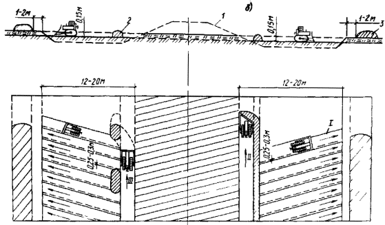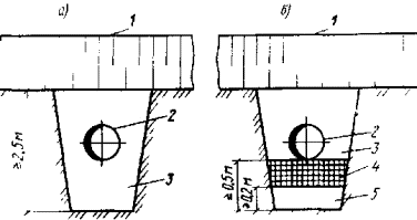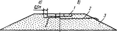 (а), с применением теплоизолирующего слоя (б); 5.11. Траншею для укладки трубопровода устраивают механизированным или взрывным способом на полную глубину с последующим разравниванием удаленного грунта вдоль дороги. 5.12. Для засыпки траншеи следует применять грунты с устойчивой структурой, большой объемной массой, высоким коэффициентом фильтрации. При их отсутствии траншеи необходимо засыпать грунтом, из которого возведено земляное полотно автомобильной дороги. 5.13. В зимний период грунт в траншею следует засыпать немедленно после укладки трубопровода, не допуская его смерзания. Засыпку осуществляют траншеезасыпателем ТР-351, а также бульдозерами массой 15 - 25 т. Если для засыпки используют мерзлый комковатый грунт, то над верхней образующей уложенного трубопровода необходимо создавать защитный слой не менее 0,2 м из мелкого разрыхленного или талого грунта. 5.14. Торф для устройства теплоизолирующего слоя доставляют из карьеров автомобилями-самосвалами. Разравнивают и уплотняют торфяной слой многократными проходами бульдозера на гусеничном или пневматическом ходу. 5.15. Плиты пенополиуретана раскладывают и закрепляют на подстилающем слое деревянными кольями или металлическими штырями. 5.16. Грунт засыпки над верхней образующей трубопровода должен иметь тот же коэффициент уплотнения, что и грунт в нижней части насыпи. Засыпку траншеи грунтом и его уплотнение следует осуществлять до заполнения трубопровода продуктами. 5.17. Контроль качества и приемку земляных работ производят в соответствии с положениями "Руководства по операционному контролю качества строительно-монтажных работ при сооружении линейной части магистральных трубопроводов" Р375-79 (ВНИИСТ. М.,1980) и требованиями СНиП III-42-80. 5.18. Земляное полотно в зоне пересечения возводят послойно в соответствии с требованиями разд. 4. При этом дорожную одежду устраивают по двухстадийной технологии. 5.19. В случае, когда предусматривается пересечение эксплуатируемой автомобильной дороги трубопроводом, необходимо строить временную объездную дорогу, включая автозимник. На участке пересечения производят демонтаж плит покрытия и разрабатывают бульдозером с предварительным рыхлением грунта поперечную траншею в насыпи на необходимую ширину. В дальнейшем работы выполняют по изложенной выше технологии. 6. РАЗРАБОТКА КАРЬЕРОВ СТРОИТЕЛЬНЫХ МАТЕРИАЛОВ6.1. Отвод земли под карьеры, очистку участков от леса, кустарника и мохорастительного покрова, устройство водоотводных канав и подъездных путей к карьерам выполняют заблаговременно. 6.2. При погрузке крупнообломочного грунтов в транспортные средства не должен попадать лед, а также камни с размером ребер более 30 см. Грунт требуемых фракций получают: назначением необходимой сетки бурения скважин для взрыва; дроблением негабаритных камней. 6.3. Необходимо заблаговременно создавать запас из обвалованных и просушенных летом песчано-гравийных грунтов, которые на зиму укрывают мхом, торфом, древесными отходами и т.д. Для уменьшения снежных заносов забой в карьерах устраивают с наветренной стороны, а валы разработанных материалов отсыпают с подветренной. Между валами предусматривают расстояние не менее 3 м. 6.4. Грунты в карьерах разрабатывают двумя способами: бульдозерами послойно по мере радиационного оттаивания с перемещением в бурты и п