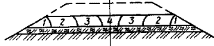 4.34. При дальности перемещения грунта до 20 м и отсутствии мохорастительного покрова в основании применяют схему укладки грунта слоями на всю ширину насыпи из каждого резерва, а более 20 м - от оси дороги к бровке. 4.35. Для сохранения мохорастительного покрова в основании насыпи (см. рис. 13), возводимой из грунтов из боковых резервов, применяют схему последовательной отсыпки первого слоя грунта от бровки к оси (рис. 28). Рис. 28. Схема возведения земляного полотна бульдозером с