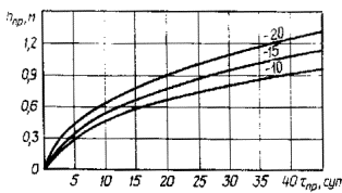 где Lc- длина участка строительства, м; Bн - ширина слоя насыпи по середине его толщины, м; tпр - время промерзания слоя, сут.; hсл - толщина отсыпаемого слоя, зависящая от скорости его промерзания, м, Ко - коэффициент относительного уплотнения грунта (отношение плотности скелета грунта в насыпи к естественной в карьере); Псм - сменная производительность, м3. При наличии в строительном подразделении определенного звена экскаваторов уточняют допустимую для него протяженность Lс участка строительства. Время промерзания грунта при послойной его укладке приведено в рекомендуемом приложении 13. 4.60. Насыпь необходимо возводить в следующем технологическом порядке: в осенний период бульдозером повышенной проходимости удаляют мохорастительный покров на ширину насыпи понизу; при установлении устойчивых отрицательных температур воздуха систематически расчищают дорожную полосу от снега бульдозером, обеспечивая промерзание грунта основания на глубину не менее 1,0 м, при этом расчетное время промерзания tпр определяют по рис. 29; доставляют глинистый грунт автомобилями-самосвалами, отсыпают продольным способом, разравнивают слоем расчетной толщины, уплотняют катком на пневматических шинах; таким образом устраивают все слои глинистой части насыпи с их промораживанием; торф доставляют из карьера и отсыпают вначале на откосные части насыпи с надвижкой его бульдозером; затем торфом закрывают поверхность глинистого грунта, отсыпая слоями по 25 - 30 см с уплотнением и промораживанием каждого; отсыпают верхнюю часть насыпи из сыпуче- и сухомерзлого песка. Рис. 29. Глубина промерзания избыточно увлажненного глинистого