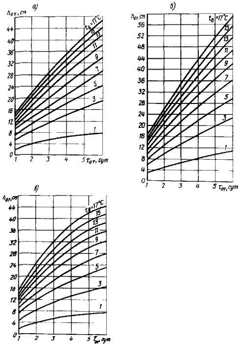 6.8. При составлении проекта производства работ необходимо для каждого объекта построить графики глубины разработки грунта при различной периодичности снятия оттаявших слоев. В соответствии с графиками выбирают тип бульдозера, учитывая при этом мощность полезной толщи. В карьерах, которые требуется разрабатывать на максимальную глубину в течение одного летнего сезона, оттаявшие слои необходимо удалять ежедневно, но не реже чем через 3 сут. 6.9. При послойном оттаивании грунт перемещают в промежуточные валы для просушивания и прогрева, а затем в накопительные бурты. Разработку талых слоев грунта необходимо начинать с нижней части карьера. На этом участке следует чаще удалять слои, чтобы увеличить уклон дна карьера и ускорить стекание воды. Промежуточные валы из оттаявшего грунта возводят высотой до 2,5 м, шириной по низу не более 6м и выдерживают для просушивания в зависимости от вида грунта: песка средней крупности - 1 - 2 сут.; песка пылеватого с содержанием пылеватых и глинистых частиц до 5% - 4 - 5 сут., от 5 до 13% - 6 - 7 сут.; супеси - 10 - 12сут. Предварительно подсушенные пылеватые пески с содержанием пылеватых и глинистых частиц от 5 до 13 % и супеси в дальнейшем укладывают в накопительные бурты тонкими слоями (до 0,5 м) для последующего просыхания. Укладку осуществляют бульдозерами способом надвижки или экскаваторами. Рис. 31. Номограмма для определения глубины оттаивания в мае - июне (а), июле (б), августе - сентябре (в). Цифры на кривых - среднесуточная температура воздуха за период оттаивания 6.10. Бурты, предназначенные для разработки в зимний период, необходимо отсыпать высотой, превышающей глубину их возможного сезонного промерзания, и защищать теплоизолирующими покрытиями из местных (мох, торф, снег и др.) и искусственных (полимерные или водно-воздушные замерзающие пены) материалов. Толщину теплоизолирующего покрытия определяют по номограмме (рис. 32). 6.11. Грунт в карьерах и буртах зимой следует разрабатывать с соблюдением следующих правил: снег с поверхности удалять из расчета освобождения площади грунта, которую экскаваторы могут разработать за одну смену, а в сильные морозы - за половину смены; передвижение транспортных средств осуществлять по дну разрабатываемого карьера; разработку буртов и карьеров, расположенных на склоне, начинать с низовой стороны. 6.12. Бурты грунта, предназначенные для разработки в летний период, следует располагать в карьере по направлению господствующих ветров, а в зимний - перпендикулярно этому направлению (для накопления утепляющих снежных отложений). Во всех случаях высота буртов должна быть не менее 6 м для обеспечения требуемой производительности экскаваторов. 6.13. При острой необходимости и соответствующем технико-экономическом обосновании допускается разрабатывать мерзлые грунты с температурой выше минус 0,3 °С тяжелыми тракторными рыхлителями с тяговым усилием на крюке не менее 200 кН, при температуре ниже минус 0,3 °С - с предварительным рыхлением буровзрывным способом. Выбор типов буровых станков, взрывчатых веществ и схем взрывания, а также общую технологию ведения буровзрывных работ осуществляют в соответствии с "Руководством по производству буровзрывных работ на строительстве БАМ (ЦНИИС. М., 1974). 6.14. Торф в карьерах разрабатывают в зимний период экскаваторами-драглайнами или с обратной лопат