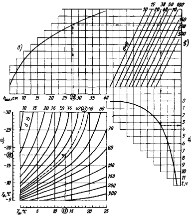 По графику (см. рисунок, а) определяют значение параметра d. Для этого на вертикальной оси (Тв) отмечают соответствующую температуру - минус 18°С, а на горизонтальной оси (Тн) - 13°С и восстанавливают из этих точек перпендикуляры до их пересечения. Из точки пересечения перпендикуляров проводят среднюю линию до ее пересечения с верхней шкалой и получают d = 47. Затем на шкале графика (см. рисунок, б) из точки hшл = 28 см восстанавливают перпендикуляр до пересечения с кривой и из этой точки проводят горизонталь до пересечения с линией, соответствующей d = 47 на графике (см. рисунок, в). Из точки пересечения опускают вертикаль до пересечения с кривой на графике (см. рисунок, г) и находят по вертикальной шкале допустимое время t = 3 ч 20 мин.