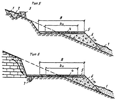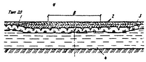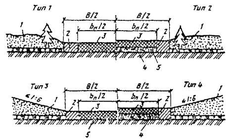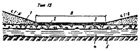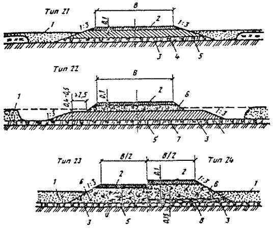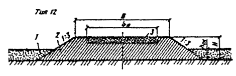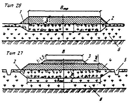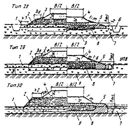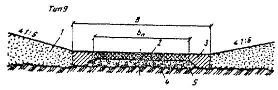 При промерзании болот на всю глубину, например на марях в I дорожно-климатической зоне, hтр и Втр в конструкциях типов 26 и 27 не нормируются. При этом ширина теплоизолирующего полотна определяется шириной полотна автозимника по табл. 2. 4.32. При прохождении трассы через обширные по площади сезонно-промерзающие торфяные болота земляное полотно регулярных автозимников I - II категорий, которые подлежат в перспективе переводу в постоянные автомобильные дороги, следует проектировать с обеспечением промораживания грунтов в основании. При этом насыпи на болотах I типа проектируют применительно к поперечному профилю типа 28, а на болотах II и III типов - применительно к поперечным профилям типа 29 и 30 (см. рис. 17). Дороги на промороженных основаниях предусматривают, как правило, при глубине болот более 1,5 м в протяженности участков более 1 км в северных районах со среднегодовыми температурами воздуха ниже 0 °С. Не рекомендуется проектировать дороги на промороженных основаниях на участках топей выклинивания и проточных топей с циркулирующими потоками болотных вод. Торфяная часть насыпи должна иметь серповидный профиль с крутизной откосов 1 : 2. Толщина намораживаемой плиты по оси дороги должна быть на 0,3 м больше, чем по бровкам. Расчет параметров земляного полотна на промороженных основаниях выполняют согласно обязательному приложению 6. 4.33. Мероприятия, направленные на продление сроков эксплуатации сухопутных автозимников и перевод их в постоянные автомобильные дороги, включают: а) более ранний ввод в эксплуатацию ледовых переправ путем усиления ледяного покрова; б) устройство водопропускных сооружений (трубы, мосты) в местах пересечения автозимника с ручьями, оврагами или балками; в) возведение земляного полотна с использованием минеральных грунтов на особо сложных участках (переходы через болота и мари, подходы к водопропускным сооружениям и т.п.); г) возведение земляного полотна на косогорах, на наледных участках и на участках, где предусмотрено смягчение продольного профиля; д) досылку земляного полотна на всем протяжении до проектных отметок. Мероприятия, направленные на продление сроков эксплуатации автозимников и последующий перевод их в постоянные автомобильные дороги, должны обеспечиваться при минимальных затратах, эффективность которых определяют согласно обязательному приложению 2. Водоотводные устройства4.34. На автозимниках, предназначенных для эксплуатации только в период с устойчивыми отрицательными температурами воздуха, не предусматривают устройства поперечных уклонов проезжей части и водоотводных сооружений. Лишь на косогорах для отвода поверхностных и грунтовых вод следует проектировать нагорные канавы или нагорные валики из грунта, а также лотки для предупреждения размыва земляного полотна в летний период и образования наледей в зимний. 4.35. На автозимниках с продленными на весенне-летний период сроками эксплуатации предусматривают проезжую часть с двускатным поперечным профилем. Поперечный уклон грунтовых покрытий принимают 30 - 40 %о. В зависимости от рельефа, гидрологических, гидрогеологических и мерзлотно-грунтовых условий поверхностные и грунтовые воды от дорожного полотна отводят с помощью следующих сооружений: боковых водоотводных канав, лотков или боковых резервов; нагорных грунтовых валико