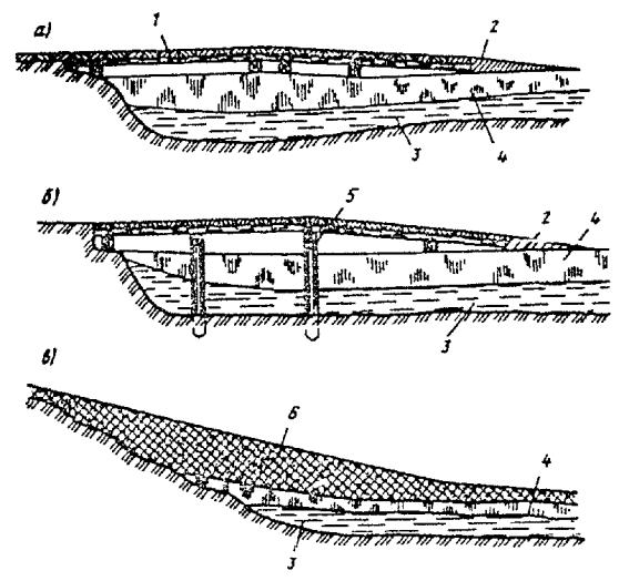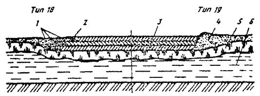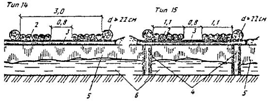 Примечания: 1. Значения приведены для льда на рекax и озерах с пресной водой, прочность которого выше, чем льда, содержащего соли. Для льда морских заливов допустимая нагрузка должна быть ниже на 20 %. 2. Допустимая нагрузка определена для ровного без трещин прозрачного слоистого льда, намерзшего с нижних слоев. Для льда с вертикальными трубочками или с сухими несквозными трещинами шириной до 3 см допустимая нагрузка должна быть снижена на 20 - 30 %. 3. При частых оттепелях, а также для льда, имеющего мокрые сквозные трещины шириной до 5 см, допустимые нагрузки принимают вдвое меньшими против норм, приведенных в таблице. Рис. 8. Усиление ледовых переправ деревянным настилом: 1 - снежный покров; 2 - колесопроводы, d > 22 см; 3 - поперечины, d > 18 см; 4 - стойки, d > 20 см; 5 - естественный ледяной покров; 6 - вода ВНИМАНИЕ! В этом месте в оригинале документа изданий 1991, 2000 г. пропущен текст.