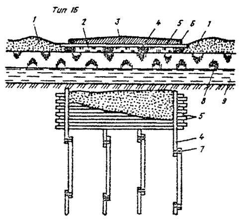 Режим дождевания (напор, скорость смещения факела, угол наклона ствола дождевателя) назначают в каждом конкретном случае с учетом температуры воздуха, скорости ветра, крупности частиц смеси и дальности их полета. Режим должен быть таким, чтобы получился монолит с содержанием песка не менее 30 % (по объему), а излишек воды выпадал в виде фирна с подветренной стороны за пределами проезжей части. В результате дождевания гидропульпы на поверхности ледовой переправы формируется монолит из зерен льда и песчаных частиц, равномерно распределенных по объему слоя износа, т.е. создается слой, обладающий абразивными свойствами и обеспечивающий высокую шероховатость коэффициент сцепления) поверхности ездового полотна в течение всего срока службы переправы. 5.57. При усилении ледовой переправы деревянным настилом (см. рис. 8, тип 14) его, как правило, укладывают на выровненный слой снега толщиной около 15 см. Поперечины лежневого настила выравнивают подбивкой снега с последующей поливкой его водой. Стыки отельных лежней устраивают вразбежку над разными поперечинами. 5.58. Усиление ледовой переправы деревянным настилом на стойках (см. рис. 8, тип 15) выполняет бригада, оснащенная ручными или легкими механическими бурами, мотопилами и мотопомпами. В местах установки стоек пробуривают лунки диаметром, несколько большим диаметра стоек. Стойки пускают в лунки до соприкосновения с дном реки и хорошо заклинивают льдом или уплотненным снегом. Примерно через сутки стойки прочно смерзаются с ледяным покровом. Затем их спиливают заподлицо со льдом и укладывают на них поперечины, которые засыпают смесью снега со льдом и замораживают. На поперечины укладывают и закрепляют колесопроводы из бревен диаметром 20 - 22 см и отборные брусья. 5.59. "Плавающие" дереволедяные переправы (см. рис. 9) устраивают следующим образом. На ледяной покров укладывают продольные лежни, связывая их проволочными скрутками. В пространстве между лежнями послойно намораживают лед, затем на лежни укладывают сплошной деревянный настил из тонкомерной древесины диаметром 12 - 14 см, который связывают проволокой после укладки отбойных брусьев. Настил засыпают слоем снега толщиной 15 - 20 см, поливают водой и промораживают. 5.60. При усилении ледовых переправ клеефанерными сборно-разборными дорожными покрытиями (см. рис. 10) на выровненный слой снега толщиной около 10 см укладывают поперечные плиты, на них - плиты основного пути. После скрепления и обжатия плит основного пути снег поливают водой на ширину переправы и промораживают. 5.61. При устройстве ледовых переправ и ледовых автозимников для более быстрого замораживания полыней применяют забрасываемые ветками перехваты в виде протянутых поперек реки жердей, соединенных проволокой, или тросов, закрепленных за колья, вмороженные в лед. Перехваты, уменьшая скорость течения воды, способствуют более быстрому образованию ледяного покрова: при температуре от минус 20 до минус 25 °С полынья замерзает в течение недели. Достаточно простой и эффективный способ замораживания полыньи - заполнение ее колотым льдом. Строительство автозимников с продленными сроками эксплуатации5.62. Подготовку грунтового основания автозимников с продленными сроками эксплуатации (см. рис. 14, типы 21 - 24) выполняют таким образом, чтобы полностью сохранить мохорастительный покр