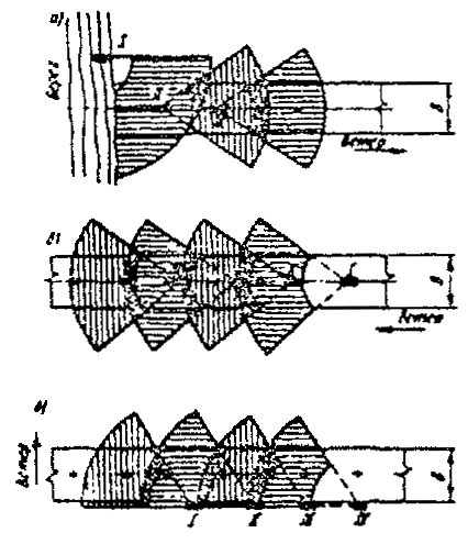 5.47. Намораживание ледовых переправ выполняют в такой последовательности: определяют толщину естественного льда и глубину водотока замерами по намеченной оси переправы; подготавливают поверхность естественного льда к намораживанию дополнительных слоев льда; намораживают послойно лед до толщины, обеспечивающей требуемую грузоподъемность переправы. 5.48. На ледовых переправах толщину естественного льда и глубину водотока замеряют через каждые 10 - 15 м в трех точках (по оси и по краям полосы) при ширине реки до 100 м; при большей ширине реки и однородном ледяном покрове расстояние между лунками может быть увеличено до 20 - 50 м. Толщину льда на крупных реках, озерах и морях при достаточной ее начальной величине целесообразно замерять с помощью радиолокационных толщиномеров типа "Зимник" (см. п. 5.36). Результаты замеров толщин льда и глубин водоема заносят в "Паспорт ледяной переправы" (см. рекомендуемое приложение 9). Одновременно устанавливают требуемую толщину намораживаемого льда на отдельных участках переправы с учетом величины расчетных нагрузок (см. справочное приложение 5) и грузоподъемности (несущей способности) ледяного покрова (пп. 4.11 и 4.20). 5.49. При подготовке поверхности льда для намораживания руководствуются следующим: наличие на льду снежного покрова высотой до 15 см и торосов высотой до 25 см практически не влияет на процесс намораживания льда; дождевание на снежный покров высотой 15 - 25 см и торосы высотой 25 - 40 см следует производить при содержании в водоледяной смеси воды 55 % и более; при толщине снежного покрова более 25 см и высоте торосов более 40 см следует предусматривать подготовку поверхности льда согласно п. 5.40. 5.50. На подготовленной поверхности льда по оси переправы устанавливают контрольные маркированные вехи через каждые 15 - 20 м высотой, превышающей проектную толщину намораживаемого слоя льда. На каждой вехе вкруговую яркой краской наносят риски на высоте, равной проектной толщине намораживаемого слоя льда. 5.51. Режим работы намораживающего агрегата типа "Град" назначают с учетом несущей способности естественного льда и направления ветра в период намораживания (рис. 19): если лед не выдерживает веса агрегата (с буксиром), то намораживание следует начинать с берега; после замерзания водоледяной смеси агрегат перемещают на искусственный лед и продолжают намораживание следующего участка (см. рис. 19, а); при толщине естественного льда, достаточной для безопасной работы агрегата, намораживание ведут, перемещая его по оси переправы (см. рис. 19, б) или вдоль ее бровки на расстояние 5 - 10 м от нее (см. рис. 19, в), чтобы исключить влияние встречного направления струи ветра. При работе на тонком льду намораживающие агрегаты следует устанавливать на деревянные щиты размером 4 ´ 0,6 ´ 0,05 м, которые располагают вдоль оси агрегата по одному под каждую опору (колесо). Рис. 19. Намораживание ледовых переправ методом дождевания: а - с берега; б - при движении