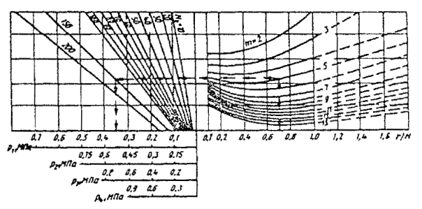 По номограмме на рис. 2 настоящего приложения при μ = 12,5 м-1 и Кг = 20 находят глубину промерзания массива из супеси h = 3,4 м и вычисляют глубину промерзания торфяной плиты под слоем грунта hгр = 1,4 м: