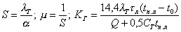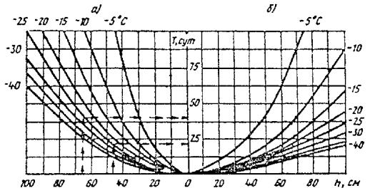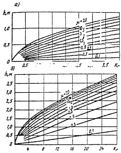 = 730[Aл(з) + (n-1) + Bл(з)] 6. Расчет глубины оттаивания земляного полотна и торфяной плиты выполняют в следующем порядке: а) устанавливают продолжительность теплого периода года τл и среднюю за этот период приведенную температуру τп.л, используя формулы (14) и (12); б) определяют для принятой конструкции и вида грунта земляного полотна расчетные значения коэффициентов теплопроводности и объемную теплоемкость материала в талом состоянии по табл. 6 настоящего приложения; в) вычисляют значения S, μ, Кг: где t0 - температура льдообразования, °С; принимается по СНиП 2.02.04-88; г) по известным значениям μ и КГ, используя график на рис. 2 настоящего приложения, находят глубину оттаивания однородного массива минерального грунта h по оси дороги; Рис. 2. Номограмма для определения глубины оттаивания (промерзания) грунта при малых (а) и больших (б) значениях КГ д) приняв по табл. 2 настоящего приложения значения hгр, определяют глубину оттаивания намороженной торфяной плиты сверху: где f - коэффициент