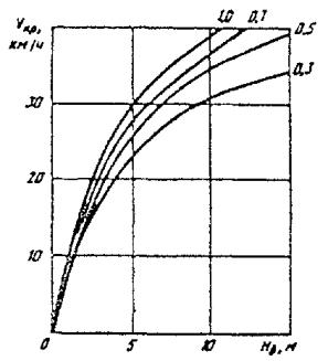 1.2. К зимним автомобильным дорогам - автозимникам - относятся сезонные дороги с полотном и дорожной одеждой из снега, льда и мерзлого грунта. 1.3. Автозимники подразделяются следующим образом: а) по продолжительности эксплуатации: регулярные, возобновляемые каждую зиму в течение ряда лет по одной и той же трассе; временные, используемые в течение одного или двух зимних сезонов; разового пользования, служащие для разового пропуска колонн автомобилей; б) по расположению на местности: сухопутные, прокладываемые по суше; ледовые, прокладываемые по льду рек, озер, водохранилищ или морей; ледяные переправы через водотоки на сухопутных автозимниках и автомобильных дорогах постоянного действия; в) по продолжительности использования сезона: обычные, предназначенные для эксплуатации только в период с устойчивыми отрицательными температур рами воздуха; автозимники с продленными сроками эксплуатации, обеспечивающие проезд в течение зимнего и части (или всего) летнего периодов года. 1.4. Регулярные и временные автозимники в зависимости от расчетной годовой грузонапряженности или расчетной интенсивности движения делятся на три категории: I - с перспективной (на 3 - 5 лет) грузонапряженностью свыше 100 тыс. т нетто в год или с расчетной интенсивностью движения, приведенной к автомобилю грузоподъемностью 5 т, свыше 500 авт/сут; II - с перспективной грузонапряженностью от 50 до 100 тыс. т. нетто в год или с расчетной интенсивностью движения от 150 до 500 авт/сут; III - с перспективной грузонапряженностью до 50 тыс. т. нетто в год или с расчетной интенсивностью движения до 150 авт/сут. 1.5. Автозимники надлежит проектировать с учетом типов транспортных средств и организации перевозок во времени по мере изменения несущей способности полотна автозимника. При обосновании проектных решений необходимо учитывать, что автозимники должны отвечать следующим требованиям: сооружаться быстрыми темпами из местных строительных материалов при максимальной механизации работ; выдерживать расчетные нагрузки всех видов транспортных средств (колесные, гусеничные, санные поезда) и обеспечивать их проезд с расчетными скоростями в течение требуемого срока эксплуатации; легко восстанавливаться после разрушения от воздействия транспортных средств и природных факторов. 2. ОСНОВНЫЕ ТЕХНИЧЕСКИЕ НОРМЫ И ТРАНСПОРТНО-ЭКСПЛУАТАЦИОННЫЕ ПОКАЗАТЕЛИ2.1. Расчетные скорости движения автомобилей при проектировании элементов плана, продольного и поперечного профилей регулярных и временных автозимников следует принимать по табл. 1. Для временных автозимников при технико-экономическом обосновании допускается уменьшать расчетные скорости движения против соответствующих значений, приведенных в табл. 1, но не более чем на 20 %. Таблица 1