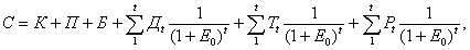 где К - затраты на строительство; П - затраты на приобретение подвижного состава; Б - затраты на строительство складов; Дt - годовые расходы на ремонт и содержание автозимника или автомобильной дороги; E0 - коэффициент приведения разновременных затрат; Е0 = 0,08; t - расчетный период суммирования затрат; Тt - годовые транспортные расходы; Рt - прочие эксплуатационные расходы. 5. Затраты на строительство автозимника, как и постоянной автомобильной дороги, устанавливают сметно-финансовыми расчетами или по укрупненным показателям стоимости аналогичных объектов для зоны проектирования. 6. Затраты на приобретение подвижного состава П определяют по формуле