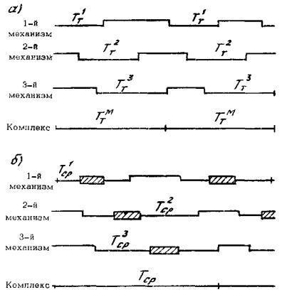 где Ттм - теоретическое, определяемое по циклограмме время работы механизмов (см. рис. 1, а); Тсрр - среднее время работ, выполняемых вручную; nр и nм - число рабочих и машин. Тогда формула (1) примет вид