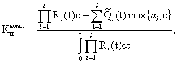 Отсюда, используя программу T1SPR2, можно найти оптимальный период профилактики m*, при котором Kп(mr) = min. Следует отметить, что Kп(mr) - функция, имеющая несколько минимумов; однако, задав степень точности e, можно найти требуемый минимум. Расчет оптимального периода профилактики при совмещенном способе производства работ дан в приложении 3 (пример 3). 3.5. Если горно-проходческий комплекс состоит из l механизмов, подверженных отказам в период их работы, то коэффициент простоя комплекса Kпкомп выразится через коэффициенты простоя отдельных механизмов Kпi: в случае последовательной работы механизмов где qi = ri/pi (ri - время работы i-го механизма на цикле; pi - время технологического перерыва i-го механизма на цикле); в случае одновременной работы механизмов
