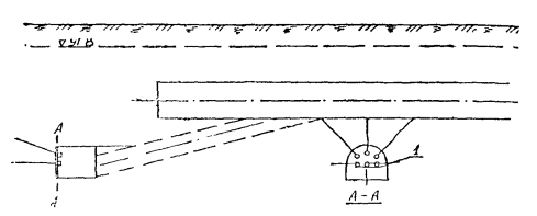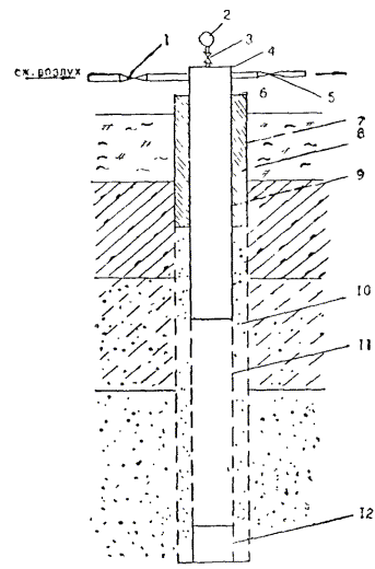 Рис. П.22.1: 1 - рабочий насос; 2 - циркуляционный бак; 3 - сливной патрубок; 4 - общий напорный трубопровод; 5 - общий обратный трубопровод; 6 - скважины, оборудованные глубинными струйными насосами; 7, 8 - пробковые краны; Q0 - рабочая вода; Q1 - избыточная вода из пласта Приложение 23Конструкция воздухоподающей скважины