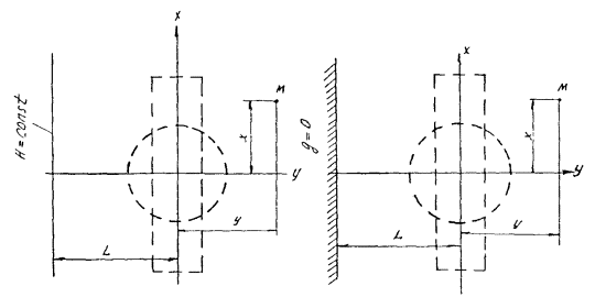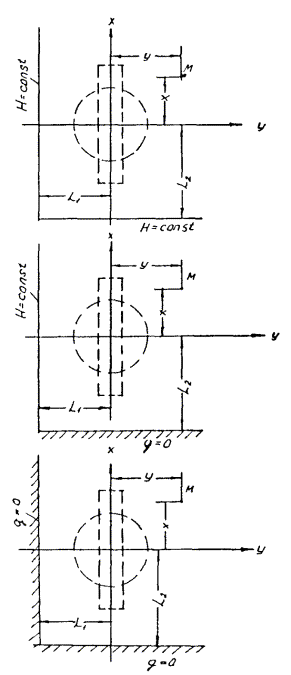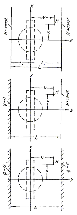 кольцевой системе, при 3. Системы скважин в ограниченных пластах Для расчетов ограниченных в плане пластов используется метод зеркального отображения и наложения течений. Ниже приводятся формулы (табл. П.1.2) для ограниченных в плане пластов, изображенных на рис. П.1.9, П.1.10 и П.1.11. N - внешнее гидравлическое сопротивление для соответствующих схем при определении напорной функции в любой точке пласта; Nу - гидравлическое сопротивление для обобщенной системы скважин в безграничном пласте: для линейной системы Nу = Nл, для кольцевой Nу = Nкр, для площадной системы Nу = Nпл. Рис. П.1.9. Схемы пластов, ограниченных контурами с одной стороны (полуограниченные пласты) Рис. П.1.10. Схемы пластов, ограниченных двумя взаимно пересекающимися прямолинейными контурами Рис. П.1.11. Схемы пластов, ограниченных двумя параллельными контурами Таблица П.1.2 Формулы для ограниченных в плане пластов