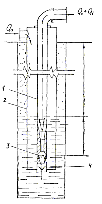 * САУ - система автоматического управления. Приложение 5Принцип работы водоструйного насосаРабочая вода от насоса на поверхности поступает в межтрубное пространство между водоподъемной 1 и наружной 2 трубами и далее к насадке струйного насоса. Струя воды, выбрасываемая из насадки, создает разрежение в приемных окнах струйного насоса и тогда, под давлением атмосферы, действующим на поверхность воды в скважине, через всасывающий патрубок 3 и отборный клапан 4, вода поступает в приемную камеру, далее в камеру смешения, где смешивается с потоком рабочей воды и по водоподъемной трубе 1 выдается наверх и затем в циркуляционный бак. На рис. П.5.1 стрелками обозначены секундные расходы: Q1 - из грунта, м3/сек; Q0 - подача рабочей воды, м3/сек. Рис. П.5.1. Схема работы водоструйного насоса: 1 - водоподъемная труба; 2 - наружная труба; 3 - всасывающий патрубок; 4 - отборный клапан Приложение 6Фильтровые покрытия из проволочной обмотки