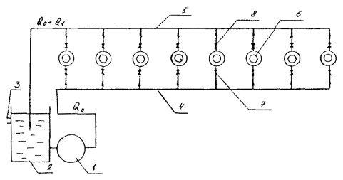 Рис. П.21.1: 1 - установка УВВ-2 (УЗВМ); 2 - вентиль на общей вакуумной магистрали; 3 - общая вакуумная магистраль; 4 - вакуум-скважины, оборудованные глубинными насосами; 5 - запорный вентиль на вакуумной магистрали к вакуум-скважине; 6 - задвижка со сливного трубопровода глубинного насоса; 7 - общий сливной трубопровод с глубинных насосов; Q0 - вода из пласта Приложение 22Технологическая схема водопонижения с глубинными струйными насосами (ЭСУ-20)